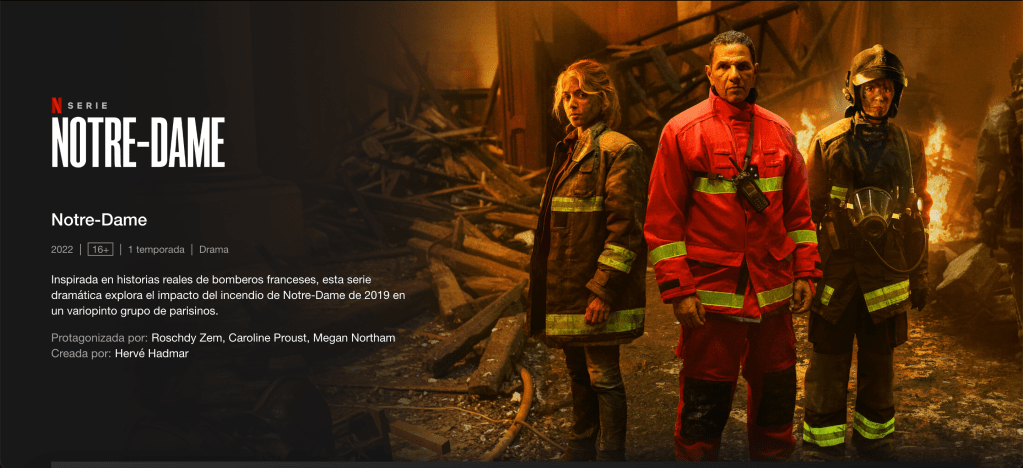 En los 6 capítulos entre realidad y ficción se ve la actuación de los bomberos para intentar controlar el fuego y a la vez se entrelaza con la vida de cada uno durante ese día tan marcado en la vida de los parisinos.