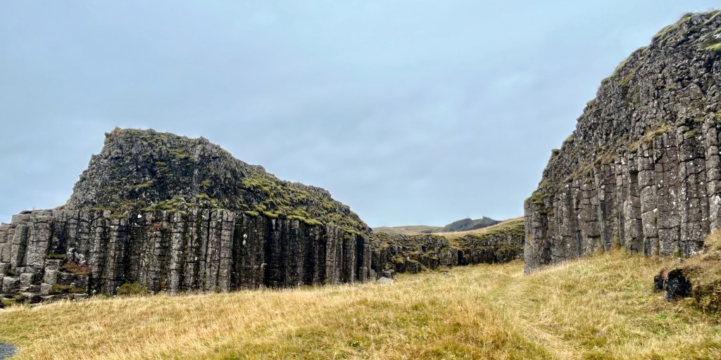 Dverghamrar, que quiere decir «acantilado de enanos», es un conjunto de columnas de basalto. Podrás pasearte al rededor de los 2 montículos y contemplar las columnas con más tranquilidad que en la playa Reynisfjara.