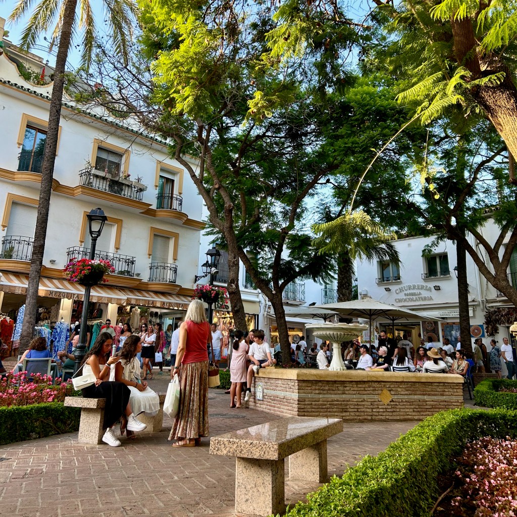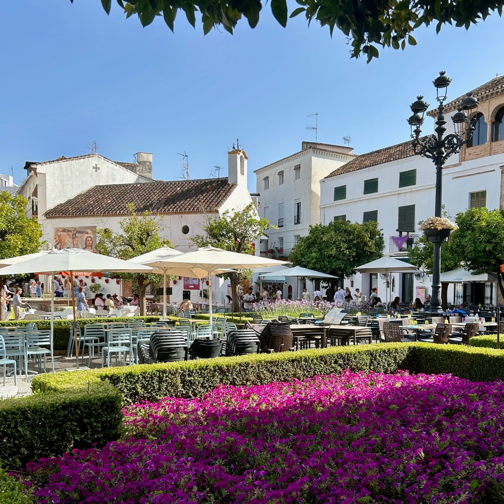 En el centro de la plaza, los naranjos en flor perfuman el aire y alrededor podrás encontrar el Ayuntamiento de Marbella, y restaurantes y cafeterías dónde tomar algo.