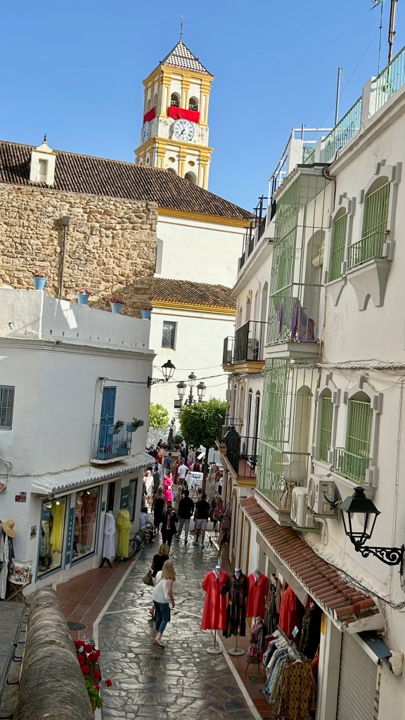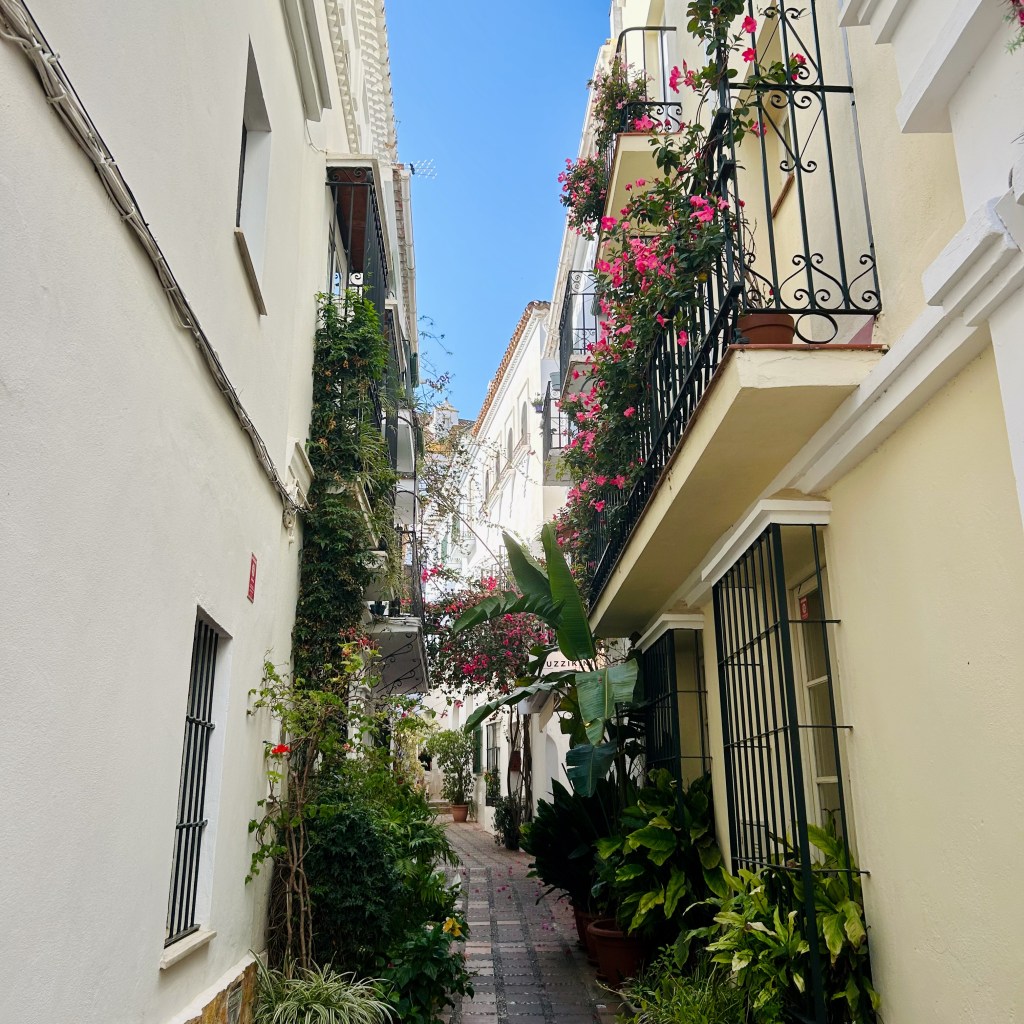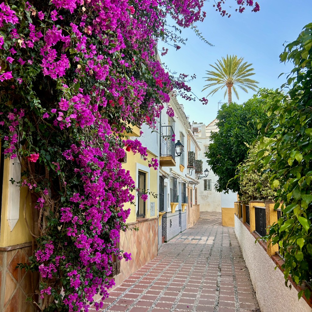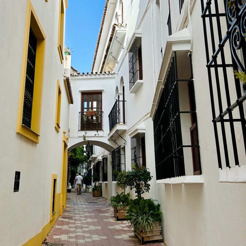 El casco antiguo de Marbella, conocido como «Marbella Vieja«, es un encantador laberinto de calles adoquinadas. Con su arquitectura típica de estilo mediterráneo de casas bajas blancas, balcones de hierro forjada y, lo más característico de las ciudades andaluzas, sus paredes decoradas con flores de colores vibrantes, crea un ambiente pintoresco y acogedor.