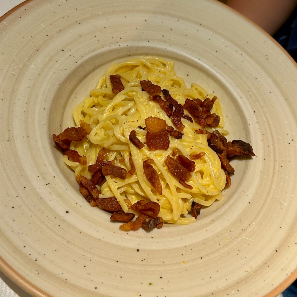 «Con yema de huevo, guanciale de verdad, queso pecorino romano y pimienta negra». Un plato clásico que no ha defraudado. La pasta estaba muy cremosa y sabrosa.